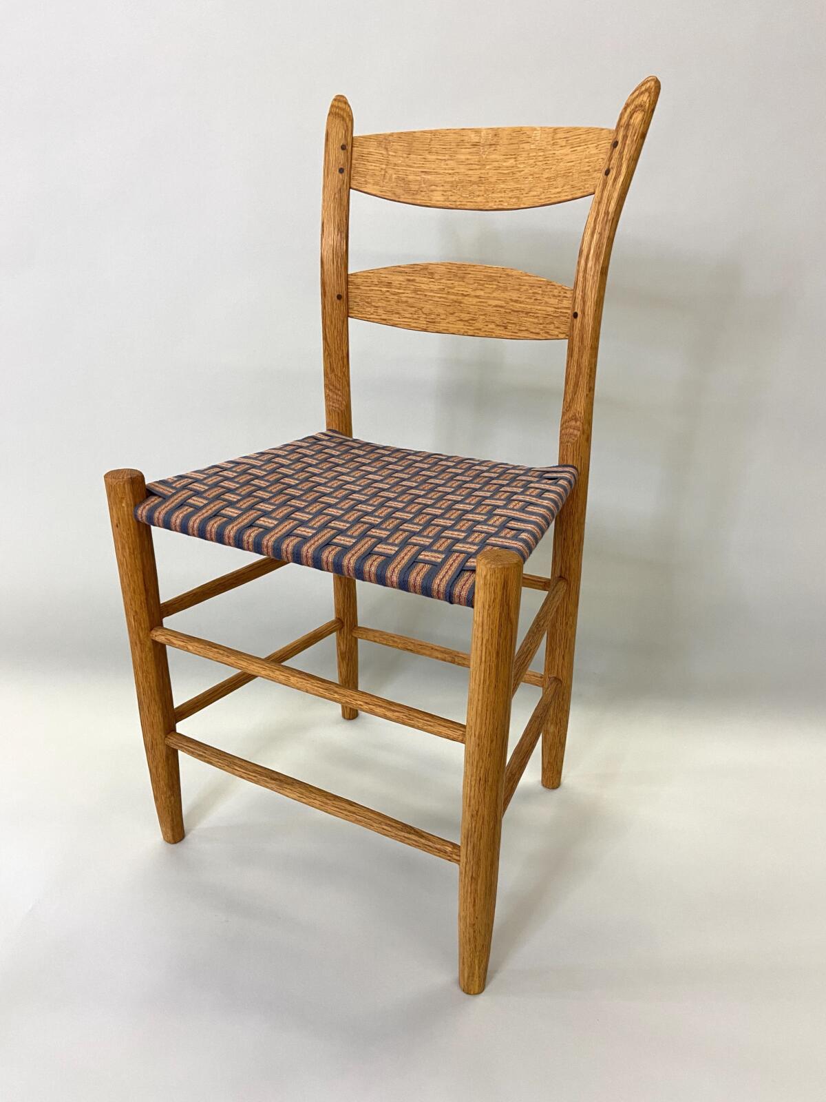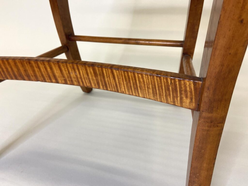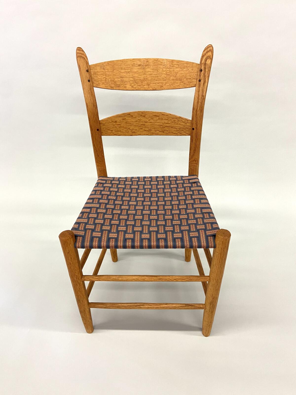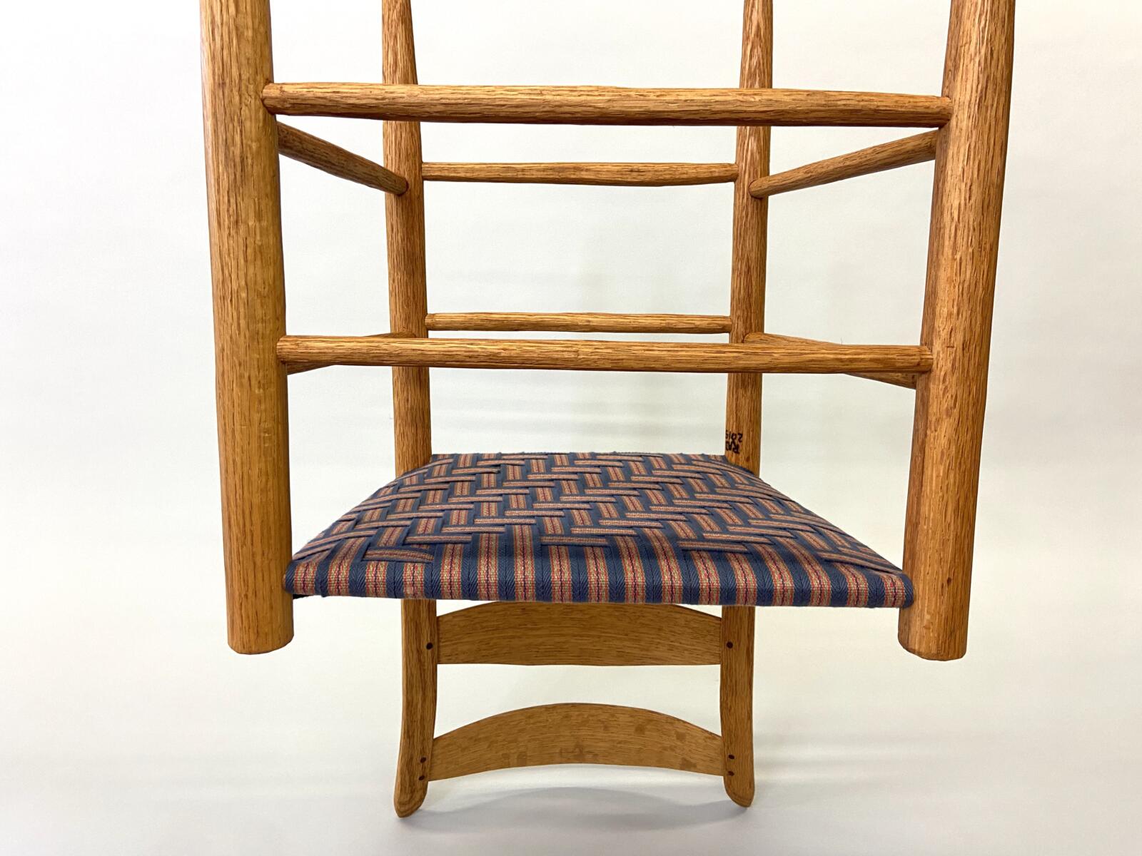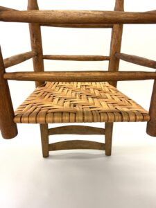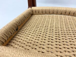 Møller No. 71 with Danish CordMøller No. 71 with Danish CordMøller No. 71 with Danish Cord – undersideMøller No. 71 with Danish Cord -with L nails and stampMid-Century Modern Møller No. 71 Chair with laced Danish Cord, woven by Dave Klingler and donated by Julia FossonJennie Alexander Chair with Shaker tape woven by Brandy Clements, chair frame made by Rue Alan DillehayShaker tape seats are traditionally woven in checkerboard on top and herringbone twill on bottom Shaker tape in flame stitch, chair frame of white oakShaker tape chair donated by Rue Alan Dillehay and woven by Brandy ClementsHickory Bark Seat by Brandy Clements on Mace chairTapering the bark at the back rail allows for no fill-ins on the sides.Mace chair frame donated by Parkway Crafts in Blowing Rock, NCThe bottom of the chair should look as good as the top.Authentic Hickory Bark on Mace Side ChairDetail of tiger maple, a common Southern wood.Fresh caned seats are a light and age over time – this one is about 5 years old at the time of photographing.Curved Seats require you to weave a little differently than flat seats. It’s not harder, just different. You have to maintain the curve or you will break your chair frame. Empire Side Chair woven by Brandy ClementsVase shaped back spat and klismos style legs make this an exceptional chair. Hand-woven Chair Caning, aka Laced Caning